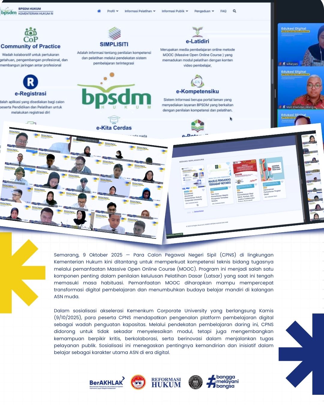 Para Calon Pegawai Negeri Sipil (CPNS) di lingkungan Kementerian Hukum kini ditantang untuk memperkuat kompetensi teknis bidang tugasnya melalui pemanfaatan Massive Open Online Course (MOOC). Program ini menjadi salah satu komponen penting dalam penilaian kelulusan Pelatihan Dasar (Latsar) yang saat ini tengah memasuki masa habituasi. Pemanfaatan MOOC diharapkan mampu mempercepat transformasi digital pembelajaran dan menumbuhkan budaya belajar mandiri di kalangan ASN muda.