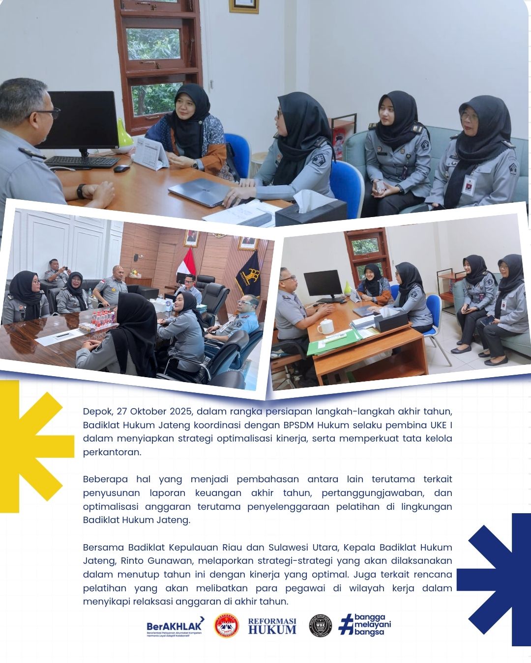 Depok, 27 Oktober 2025, dalam rangka persiapan langkah-langkah akhir tahun, Badiklat Hukum Jateng koordinasi dengan BPSDM Hukum selaku pembina UKE I dalam menyiapkan strategi optimalisasi kinerja, serta memperkuat tata kelola perkantoran.