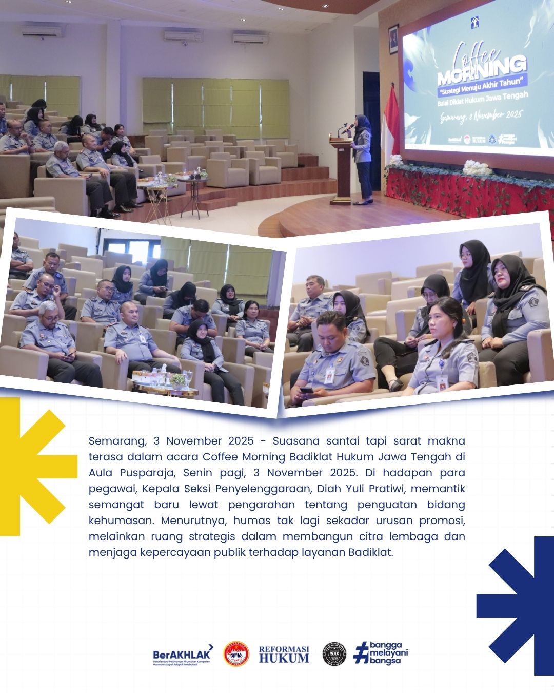 Suasana santai tapi sarat makna terasa dalam acara Coffee Morning Badiklat Hukum Jawa Tengah di Aula Pusparaja, Senin pagi, 3 November 2025. Di hadapan para pegawai, Kepala Seksi Penyelenggaraan, Diah Yuli Pratiwi, memantik semangat baru lewat pengarahan tentang penguatan bidang kehumasan. Menurutnya, humas tak lagi sekadar urusan promosi, melainkan ruang strategis dalam membangun citra lembaga dan menjaga kepercayaan publik terhadap layanan Badiklat.