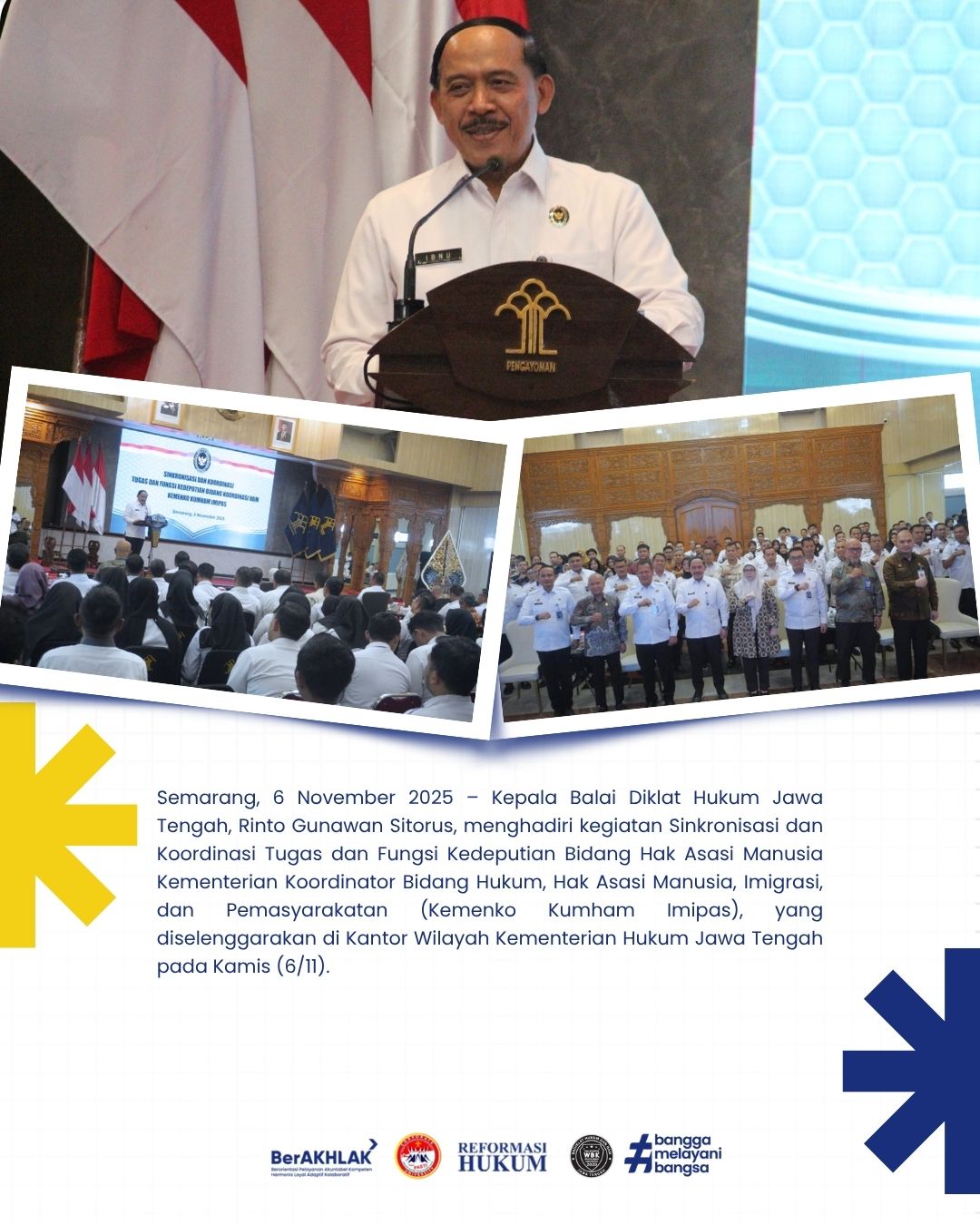 Semarang, 6 November 2025 – Kepala Balai Diklat Hukum Jawa Tengah, Rinto Gunawan Sitorus, menghadiri kegiatan Sinkronisasi dan Koordinasi Tugas dan Fungsi Kedeputian Bidang Hak Asasi Manusia Kementerian Koordinator Bidang Hukum, Hak Asasi Manusia, Imigrasi, dan Pemasyarakatan (Kemenko Kumham Imipas), yang diselenggarakan di Kantor Wilayah Kementerian Hukum Jawa Tengah pada Kamis (6/11).