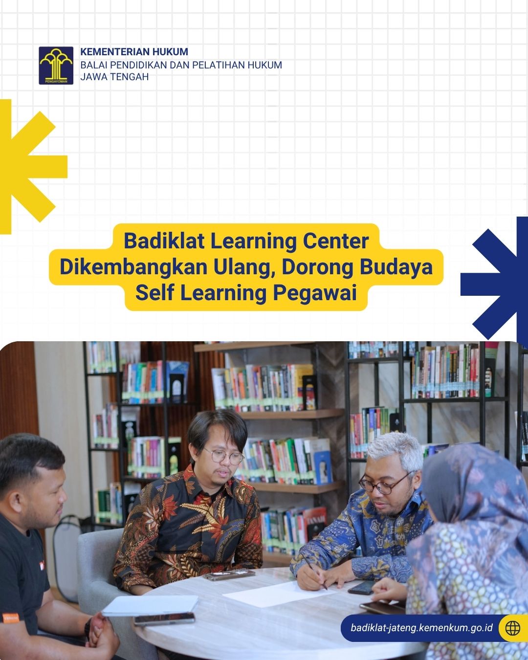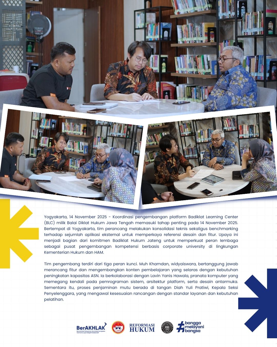 Yogyakarta, 14 November 2025 - Koordinasi pengembangan platform Badiklat Learning Center (BLC) milik Balai Diklat Hukum Jawa Tengah memasuki tahap penting pada 14 November 2025. Bertempat di Yogyakarta, tim perancang melakukan konsolidasi teknis sekaligus benchmarking terhadap sejumlah aplikasi eksternal untuk memperkaya referensi desain dan fitur. Upaya ini menjadi bagian dari komitmen Badiklat Hukum Jateng untuk memperkuat peran lembaga sebagai pusat pengembangan kompetensi berbasis corporate university di lingkungan Kementerian Hukum dan HAM.