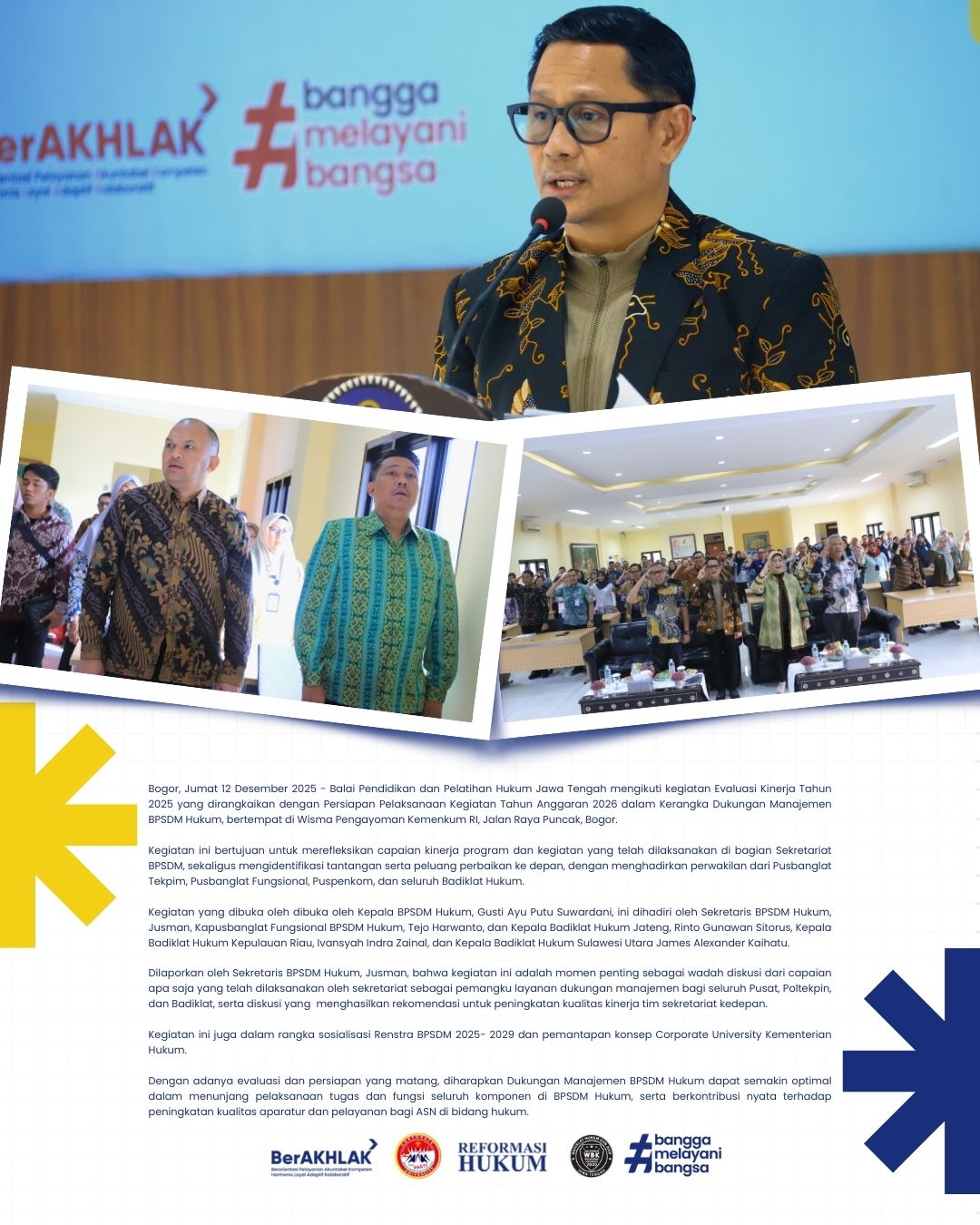 Bogor, Jumat 12 Desember 2025 - Balai Pendidikan dan Pelatihan Hukum Jawa Tengah mengikuti kegiatan Evaluasi Kinerja Tahun 2025 yang dirangkaikan dengan Persiapan Pelaksanaan Kegiatan Tahun Anggaran 2026 dalam Kerangka Dukungan Manajemen BPSDM Hukum, bertempat di Wisma Pengayoman Kemenkum RI, Jalan Raya Puncak, Bogor.